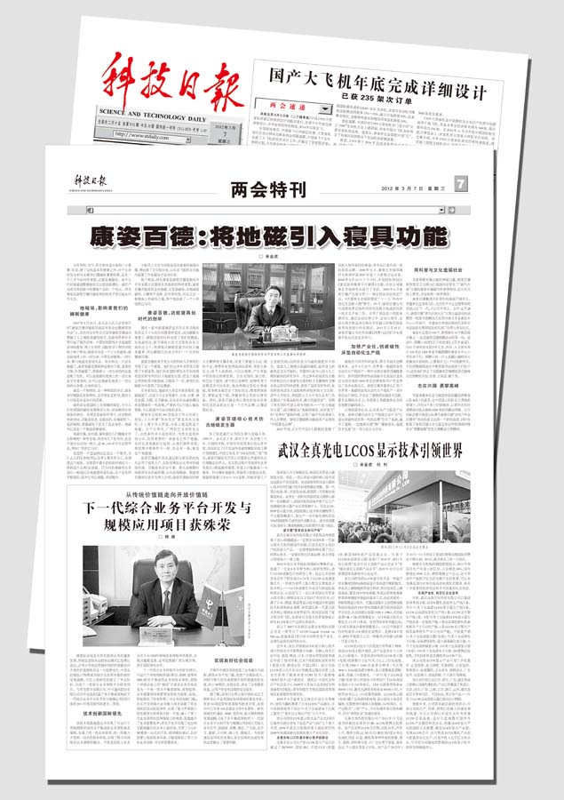 2012年3月7日,《科技日報》兩會特刊對秦皇島康姿百德高新技術開發(fā)有限公司進行了大篇幅的專題報道。整篇報道立體地展現(xiàn)了康姿百德磁性功能寢具的獨特優(yōu)勢,全面地回顧了康姿百德輝煌的發(fā)展歷程。