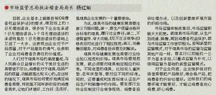 為此,寢具市場(chǎng)的健康發(fā)展需要注意三方面問(wèn)題。第一,要生產(chǎn)質(zhì)量合格符合標(biāo)準(zhǔn)的寢具,履行社會(huì)責(zé)任;第二,不虛假宣傳、夸大功能,《反不正當(dāng)競(jìng)爭(zhēng)法》修改后對(duì)此進(jìn)行了相應(yīng)規(guī)范;第三,完善售后服務(wù),對(duì)消費(fèi)者投訴要及時(shí)解決。