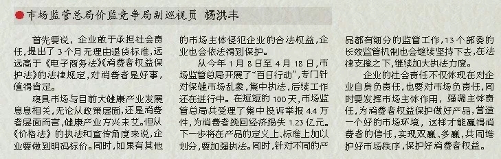 企業(yè)的社會(huì)責(zé)任不僅體現(xiàn)在對(duì)企業(yè)自身負(fù)責(zé)任,也要對(duì)市場(chǎng)負(fù)責(zé)任,同時(shí)要發(fā)揮市場(chǎng)主體作用,強(qiáng)調(diào)主體責(zé)任,為消費(fèi)者權(quán)益保護(hù)做好產(chǎn)品,營(yíng)造一個(gè)好的市場(chǎng)環(huán)境,這樣才能贏得消費(fèi)者的信任,實(shí)現(xiàn)雙贏、多贏,共同維護(hù)好市場(chǎng)秩序,保護(hù)好消費(fèi)者權(quán)益。