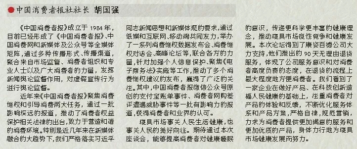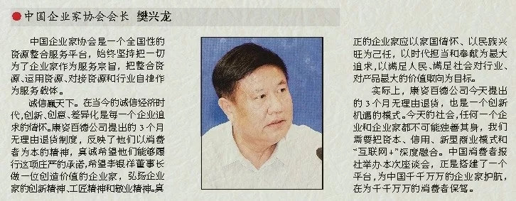 實(shí)際上,康姿百德公司今天提出的3個(gè)月無(wú)理由退貨,也是一個(gè)創(chuàng)新機(jī)遇的模式。今天的社會(huì),任何一個(gè)企業(yè)和企業(yè)家都不可能獨(dú)善其身,我們需要把資本、信用、新型商業(yè)模式和“互聯(lián)網(wǎng)+”深度融合。中國(guó)消費(fèi)者報(bào)社舉辦本次座談會(huì),正是搭建了一個(gè)平臺(tái),為中國(guó)千千萬(wàn)萬(wàn)的企業(yè)家護(hù)航,在為千千萬(wàn)萬(wàn)的消費(fèi)者保駕。