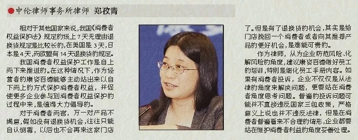 作為律師,從為企業(yè)防范風(fēng)險(xiǎn)、化解風(fēng)險(xiǎn)的角度,建議康姿百德做好員工的培訓(xùn),特別是細(xì)化員工手冊(cè)內(nèi)容。如果有消費(fèi)者投訴,企業(yè)不僅僅是從法律的角度來(lái)解決問(wèn)題,更要站在消費(fèi)者角度思考問(wèn)題。普遍的投訴問(wèn)題可能并不直接違反國(guó)家三包政策,嚴(yán)格意義上說(shuō)也并不違反法律,但是在消費(fèi)者普遍看來(lái)不合理的情形,企業(yè)都要站在維護(hù)消費(fèi)者利益的角度妥善處理。