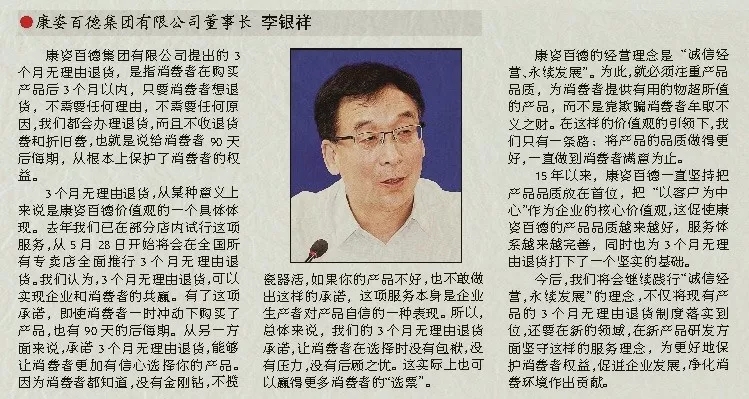 誠(chéng)信贏天下。在當(dāng)今的誠(chéng)信經(jīng)濟(jì)時(shí)代,創(chuàng)新、創(chuàng)意、差異化是每一個(gè)企業(yè)追求的情懷。康姿百德公司提出的3個(gè)月無(wú)理由退貨制度,反映了他們以消費(fèi)者為本的精神,真誠(chéng)希望他們能夠履行這項(xiàng)莊嚴(yán)的承諾,希望李銀祥董事長(zhǎng)做一位創(chuàng)造價(jià)值的企業(yè)家,弘揚(yáng)企業(yè)家的創(chuàng)新精神、工匠精神和敬業(yè)精神。真正的企業(yè)家應(yīng)以家國(guó)情懷、以民族興旺為己任,以時(shí)代擔(dān)當(dāng)和奉獻(xiàn)為最大追求,以滿(mǎn)足人民、滿(mǎn)足社會(huì)對(duì)行業(yè)、對(duì)產(chǎn)品最大的價(jià)值取向?yàn)槟繕?biāo)。