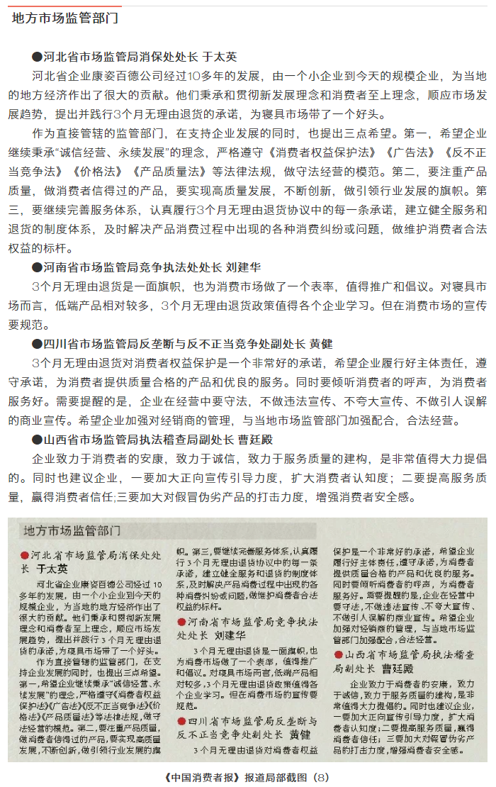 中國(guó)消費(fèi)者報(bào)訊 為構(gòu)建良好的消費(fèi)環(huán)境,規(guī)范寢具市場(chǎng)秩序,推動(dòng)寢具行業(yè)自律和健康發(fā)展,由中國(guó)消費(fèi)者報(bào)社主辦、康姿百德集團(tuán)有限公司協(xié)辦的“寢具市場(chǎng)秩序與消費(fèi)者權(quán)益保護(hù)”座談會(huì)于2019年5月28日在北京召開(kāi),來(lái)自國(guó)家市場(chǎng)監(jiān)督管理總局相關(guān)司局、中國(guó)企業(yè)家協(xié)會(huì)的相關(guān)領(lǐng)導(dǎo)、專(zhuān)家及寢具知名企業(yè)代表,圍繞消費(fèi)者權(quán)益保護(hù)、促進(jìn)寢具市場(chǎng)良性競(jìng)爭(zhēng)與規(guī)范發(fā)展等話(huà)題進(jìn)行了深入探討。本次座談會(huì)上,與會(huì)代表共同見(jiàn)證了康姿百德公司承諾“3個(gè)月無(wú)理由退貨”啟動(dòng)儀式。