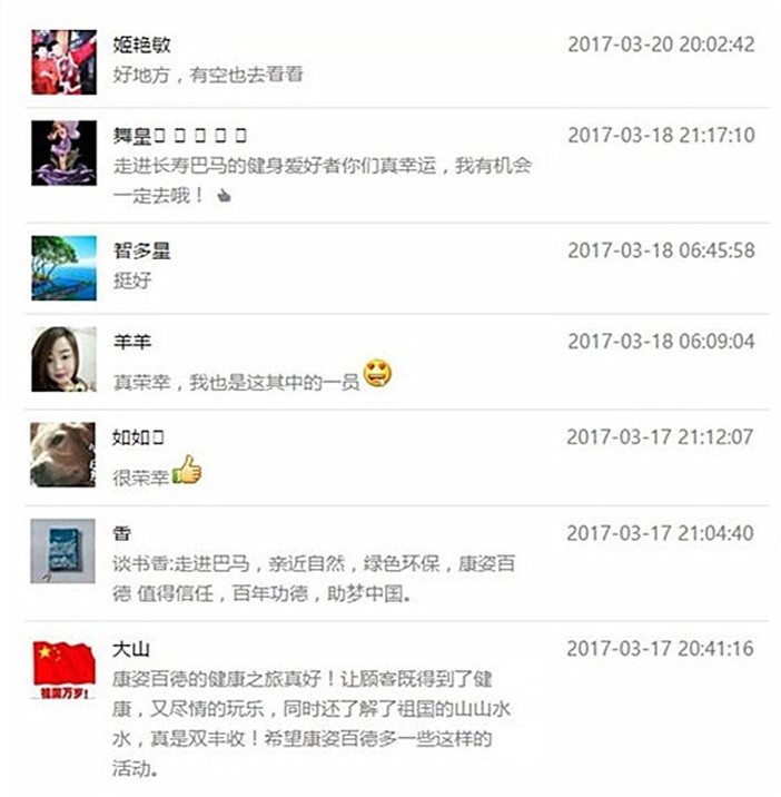 此次“走進(jìn)長壽巴馬 共譜健康人生”健康之旅活動反響熱烈,得到了健身愛好者的廣泛好評。自前幾篇報道巴馬健康之旅的文章發(fā)出后,許多健身愛好者都通過在微信公眾平臺文章下方留言評論的方式表達(dá)了自己的體會和感受。
