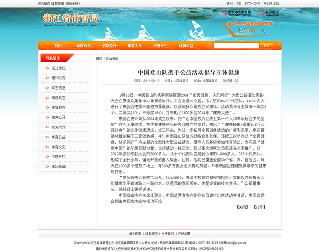 浙江體育局官網(wǎng)以《中國登山隊攜手公益活動倡導立體健康》為題,對2014“全民健身 快樂同行”大型公益活動表彰大會進行報道。