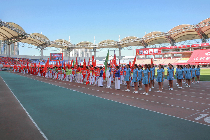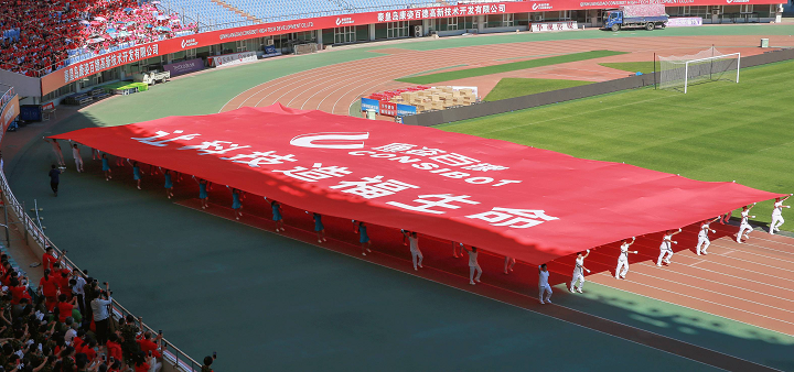 大賽初始,伴隨著激動(dòng)人心的音樂, 一幅608平方米的巨型康姿百德紅旗步入賽場,康姿百德91名工作人員共舉旗幟,整齊自如地緩緩前行,給人以極大的視覺沖擊。