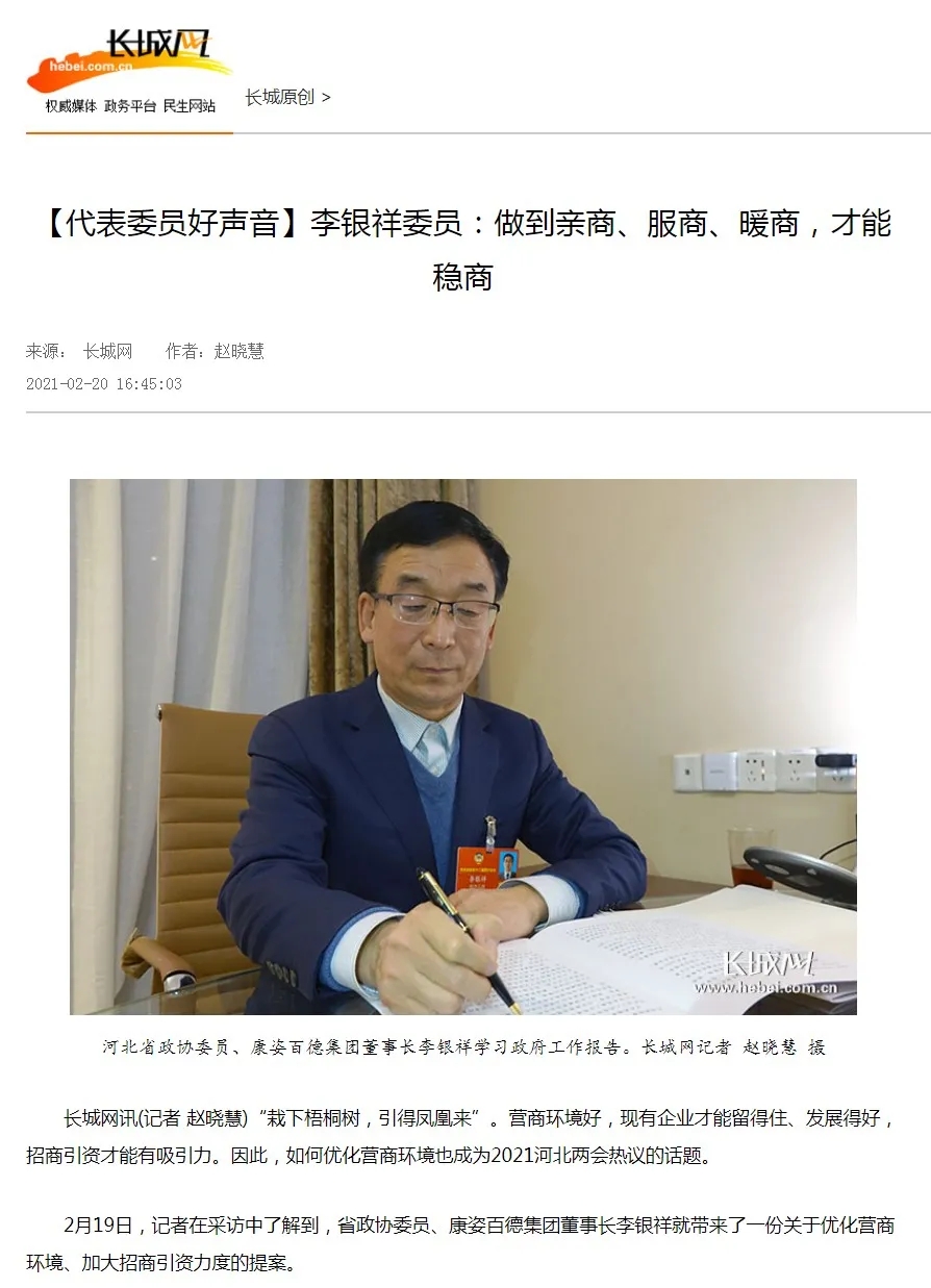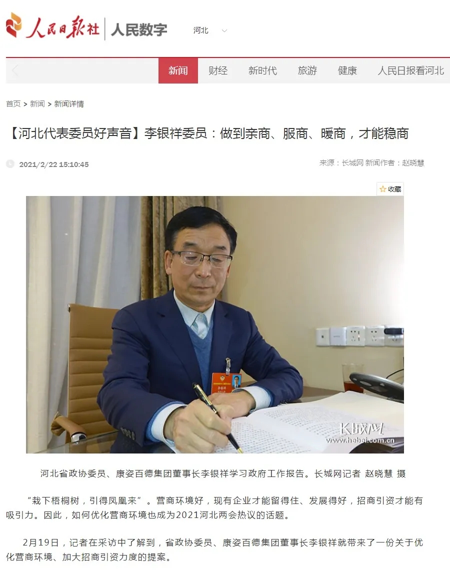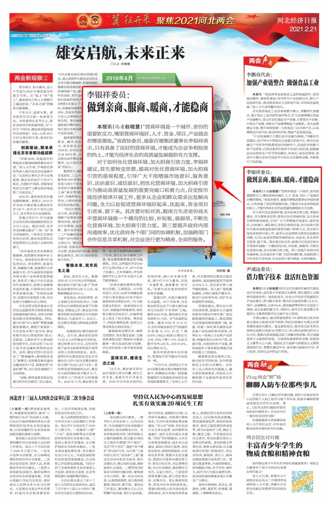 在河北省兩會(huì)政協(xié)委員駐地,李銀祥委員接受了河北經(jīng)濟(jì)日?qǐng)?bào)的專訪。在受訪的過(guò)程中,李銀祥董事長(zhǎng)針對(duì)2021河北兩會(huì)如何優(yōu)化營(yíng)商環(huán)境的熱議話題,簡(jiǎn)述了關(guān)于優(yōu)化營(yíng)商環(huán)境、加大招商引資力度的提案。李銀祥董事長(zhǎng)的提案還被刊登在了2021年2月21日的河北經(jīng)濟(jì)日?qǐng)?bào)上。