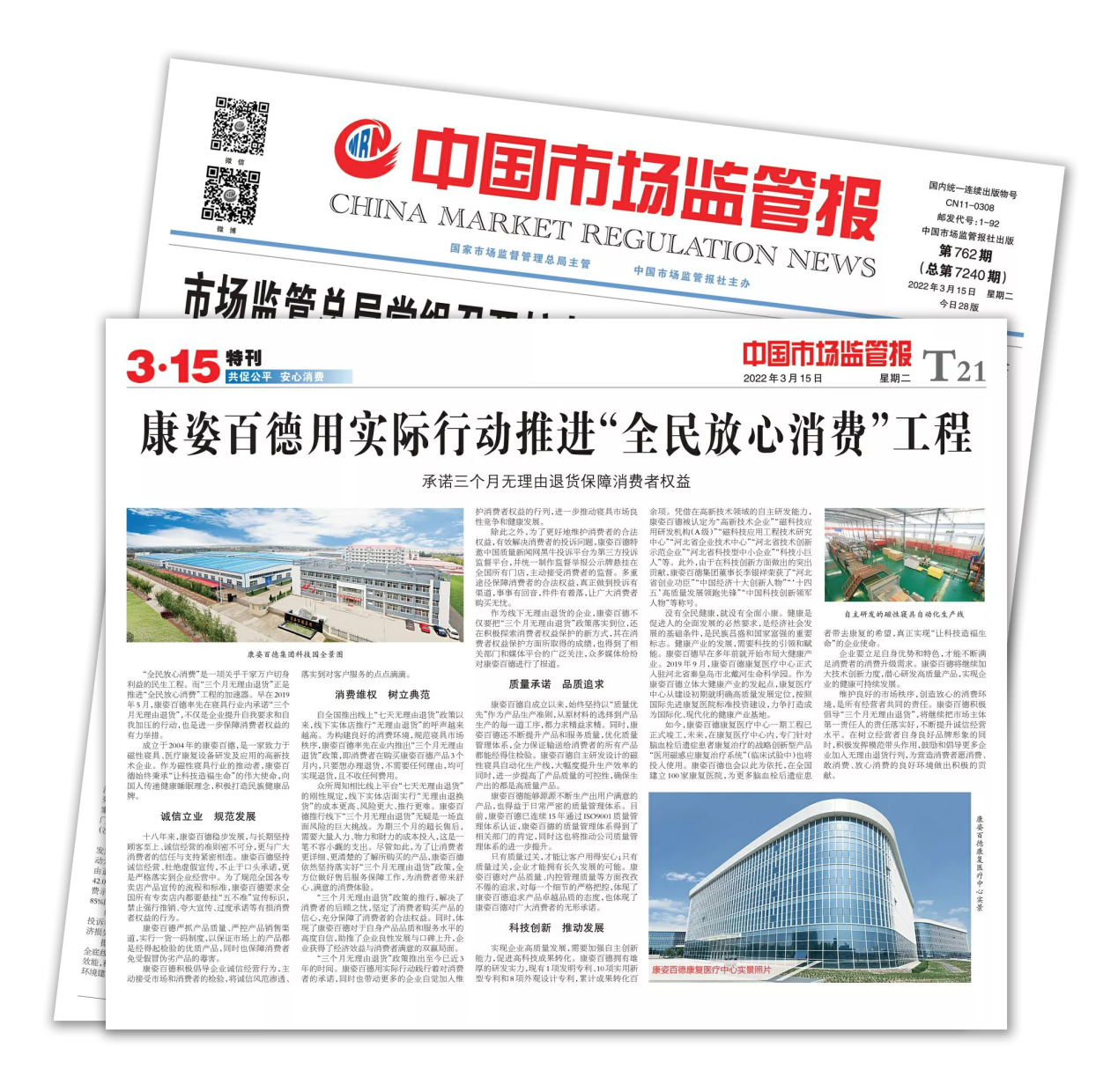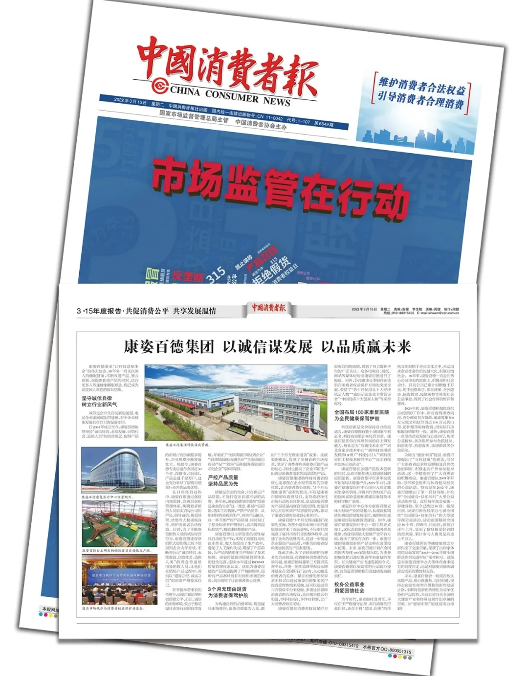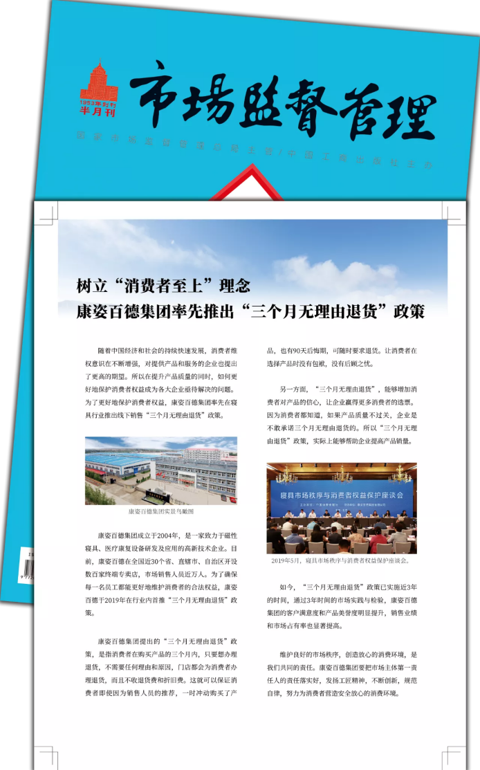 《中國市場監(jiān)管報》由國家市場監(jiān)督管理總局主管,是一張面向全國工商行政管理和市場監(jiān)管部門系統(tǒng)、廣大工商企業(yè)和消費者讀者的經(jīng)濟法制類報紙,是宣傳工商行政管理工作、詮釋工商行政管理法律法規(guī)的權(quán)威媒體??底税俚履軌驑s登《中國市場監(jiān)管報》,說明康姿百德在消費者維權(quán)方面所做出的突出貢獻,得到了社會各界的充分肯定,也贏得了廣大消費者的贊譽。
