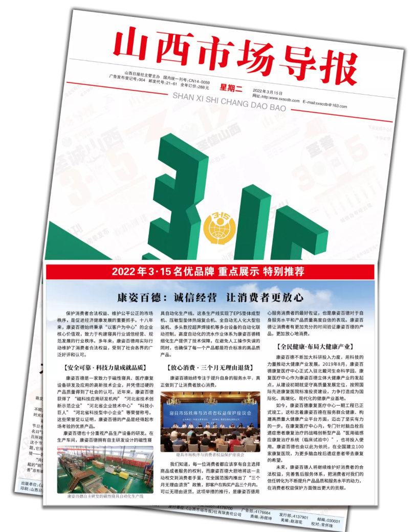 《山西市場導(dǎo)報》以“康姿百德:誠信經(jīng)營 讓消費者更放心”為主題對康姿百德的報道?!渡轿魇袌鰧?dǎo)報》是由山西省工商行政管理局主管主辦的機關(guān)報。
