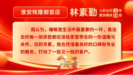 作為康姿百德專賣店的店員,林素勤常常掛在嘴邊的一句話就是“在崗一分鐘,敬業(yè)60秒”。每一分、每一秒都要?jiǎng)?chuàng)造價(jià)值。她的這份敬業(yè)不僅表現(xiàn)在不溜崗、不空崗,不忙的時(shí)候她還會(huì)花心思布置展區(qū)、學(xué)習(xí)產(chǎn)品知識(shí),以最充足的準(zhǔn)備迎接客戶。她一直認(rèn)為,成交不是銷售的終止,在征集客戶同意的前提下,她會(huì)做不定期的售后追蹤,及時(shí)解決客戶在使用中遇到的問題,并給予正確指導(dǎo)。她認(rèn)為,睡眠是生活中最重要的一環(huán),售出去的每一張床墊都應(yīng)該給家里帶去的一份溫暖與關(guān)懷。日積月累,林素勤用她良好的口碑和專業(yè)的服務(wù),打動(dòng)了一批又一批的客戶。