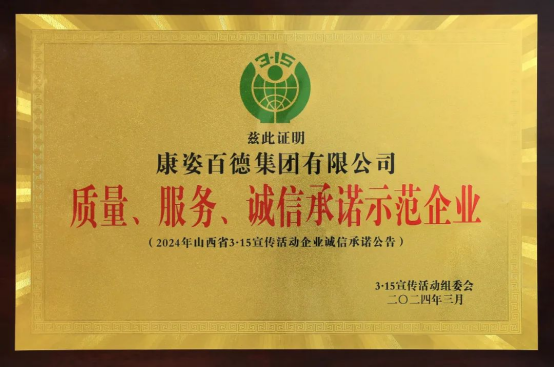 康姿百德被山西315宣傳活動組委會授予“質(zhì)量 服務 誠信承諾示范企業(yè)”榮譽稱號