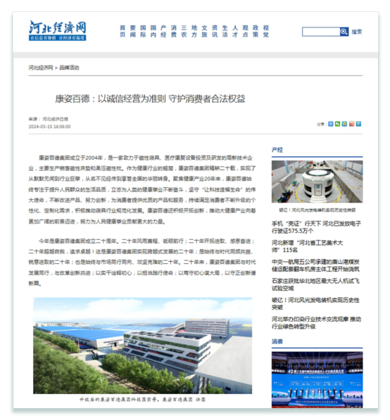 《河北經(jīng)濟日報》由河北日報報業(yè)集團主辦,是河北省委、省政府指導全省經(jīng)濟工作的重要輿論陣地。作為河北省優(yōu)秀企業(yè),康姿百德拉動了經(jīng)濟消費,對河北省乃至全國消費者權益保護起到了積極、深遠的影響。因在誠信經(jīng)營和消費者權益保護等方面取得的優(yōu)異成績,《河北經(jīng)濟日報》連續(xù)6年對康姿百德進行報道。