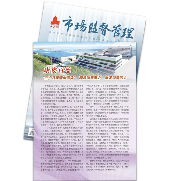 今年12月,《市場監(jiān)督管理》半月刊專題報道再次以《康姿百德“三個月無理由退貨”--釋放消費潛力 激發(fā)消費活力》為題,全面、詳細地報道了康姿百德?!妒袌霰O(jiān)督管理》半月刊對康姿百德的多次專題報道,是對康姿百德的認可,也是激勵。康姿百德將一如既往地堅持誠信經(jīng)營,不斷提升產(chǎn)品和服務質(zhì)量,為寢具市場在保障消費者權益方面做出表率,帶動更多企業(yè)推行無理由退貨制度,為經(jīng)濟高質(zhì)量發(fā)展做出新的貢獻。