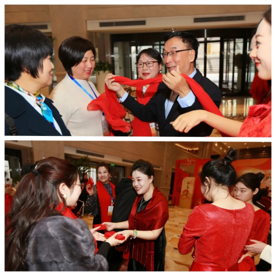 年會伊始,一條鮮紅的星光大道從會場入口延伸至主舞臺。全體參會家人身著正裝,神采奕奕踏上紅毯,在攝影鏡頭的聚焦下展現(xiàn)自信風(fēng)采。董事長李銀祥攜管理層團隊親自迎接,為每一位家人佩戴象征“鴻運當(dāng)頭”的定制紅絲巾。簽名墻上,密密麻麻的名字不僅記錄著2024年的奮斗足跡,更寫滿對2025年的熱切期待。