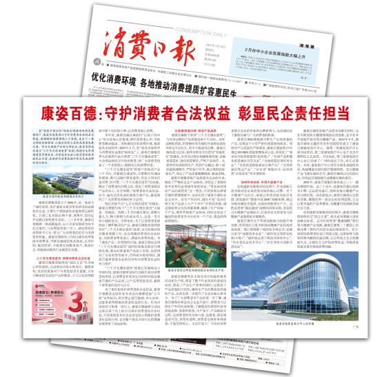 《消費(fèi)日?qǐng)?bào)》于1985年創(chuàng)刊,由國(guó)務(wù)院國(guó)有資產(chǎn)監(jiān)督管理委員會(huì)舉辦,中國(guó)輕工業(yè)聯(lián)合會(huì)主管主辦??底税俚路e極響應(yīng)國(guó)家號(hào)召,主動(dòng)維護(hù)消費(fèi)者合法權(quán)益,僅2024年,消費(fèi)日?qǐng)?bào)就2次對(duì)康姿百德進(jìn)行了專版報(bào)道。