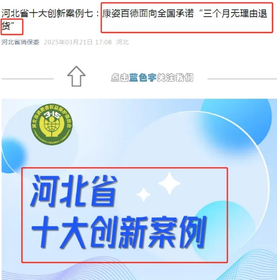 河北省消費者權(quán)益保護委員會還在其官方微信公眾號上,對康姿百德入選“河北省十大創(chuàng)新案例”進行了專題推送,將“三個月無理由退貨”作為典范向社會公開推廣。(原文鏈接請點擊:河北省十大創(chuàng)新案例七:康姿百德面向全國承諾“三個月無理由退貨”